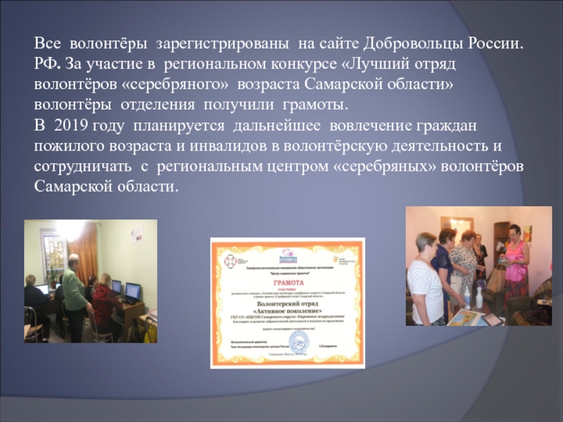 В 2019 году планируется дальнейшее вовлечение граждан пожилого возраста и инвалидов в волонтёрскую деятельность и сотрудничать с региональным центром «серебряных» волонтёров Самарской области.