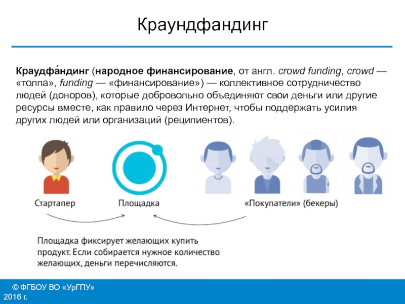 Краудфа́ндинг (народное финансирование, от англ. сrowd funding, сrowd — «толпа», funding — «финансирование») — коллективное сотрудничество людей (доноров), которые добровольно объединяют свои деньги или другие ресурсы вместе, как правило через Интернет, чтобы поддержать усилия других людей или организаций (реципиентов).