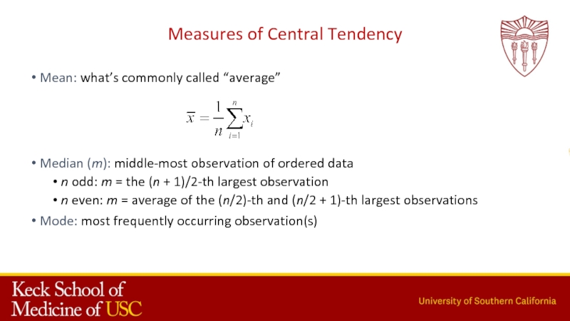 n even: m = average of the (n/2)-th and (n/2 + 1)-th largest observations