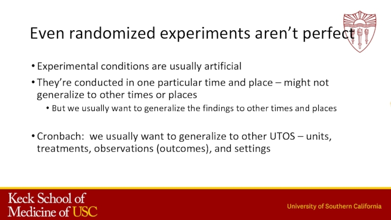Cronbach: we usually want to generalize to other UTOS – units, treatments, observations (outcomes), and settings