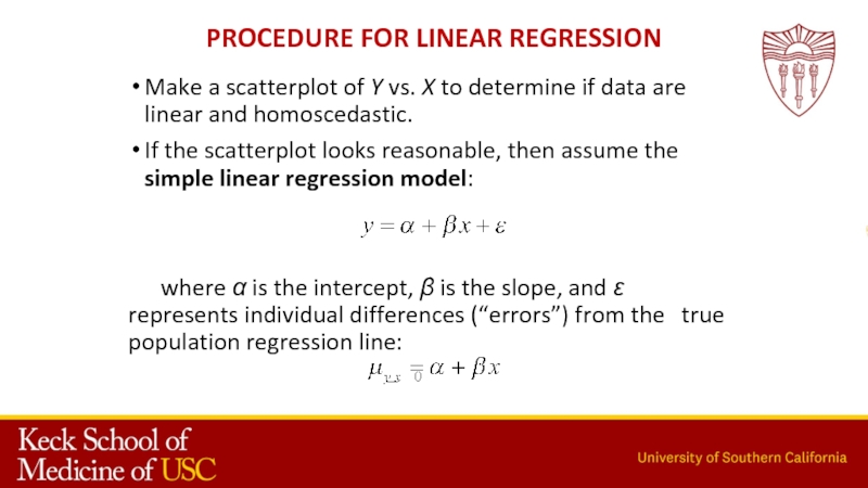 scatterplot looks reasonable, then assume the simple linear regression model: