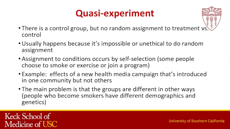 Assignment to conditions occurs by self-selection (some people choose to smoke or exercise or join a program)