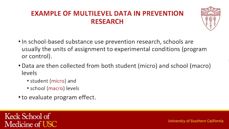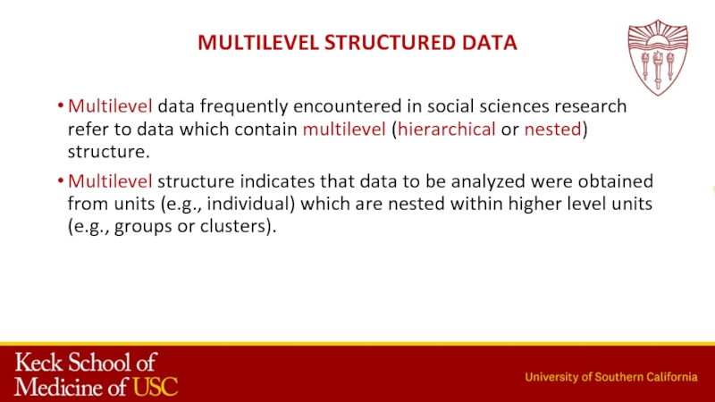 Multilevel structure indicates that data to be analyzed were obtained from units (e.g., individual) which are nested within higher level units (e.g., groups or clusters).