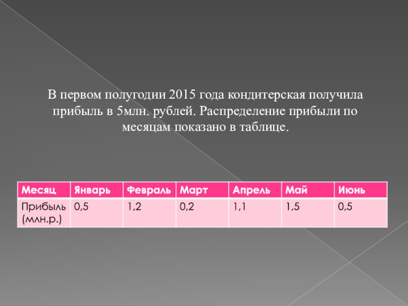 Слайд 2В первом полугодии 2015 года кондитерская получила прибыль в 5млн.