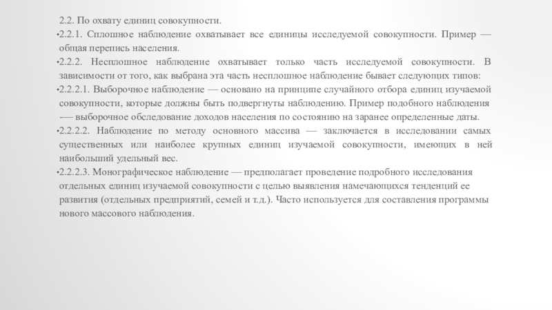 2.2.2.1. Выборочное наблюдение — основано на принципе случайного отбора единиц изучаемой совокупности, которые должны быть подвергнуты наблюдению. Пример подобного наблюдения -— выборочное обследование доходов населения по состоянию на заранее определенные даты.