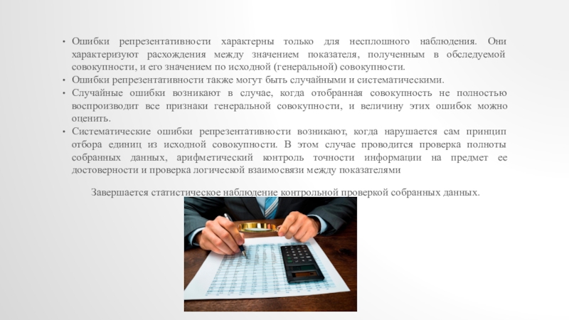 Слайд 16Ошибки репрезентативности характерны только для несплошного наблюдения. Они характеризуют расхождения