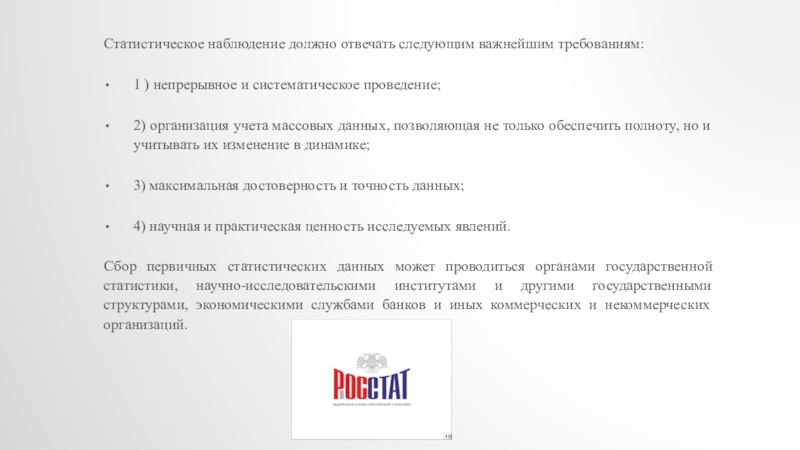 Слайд 5Статистическое наблюдение должно отвечать следующим важнейшим требованиям: