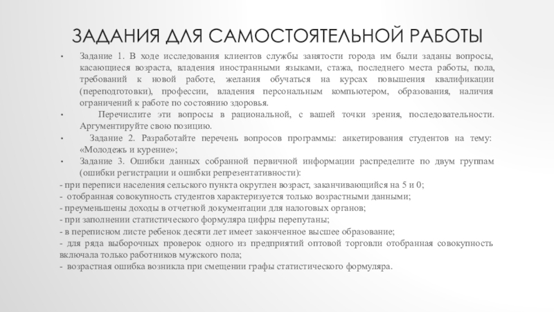 Задание 3. Ошибки данных собранной первичной информации распределите по двум группам (ошибки регистрации и ошибки репрезентативности):