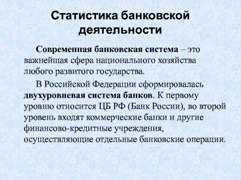 К первому уровню относится ЦБ РФ (Банк России), во второй уровень входят коммерческие банки и другие финансово-кредитные учреждения, осуществляющие отдельные банковские операции.