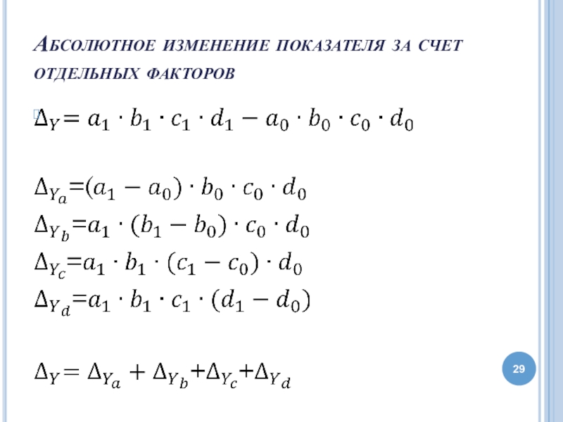 Слайд 29Абсолютное изменение показателя за счет отдельных факторов
