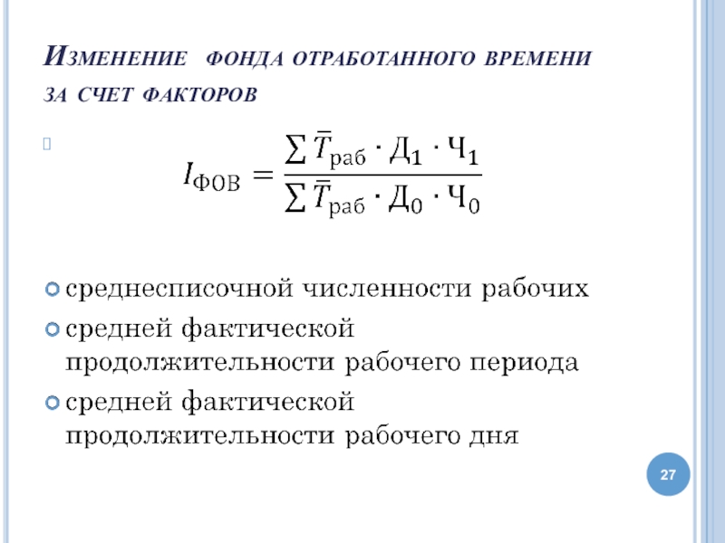 Слайд 27Изменение фонда отработанного времени за счет факторов