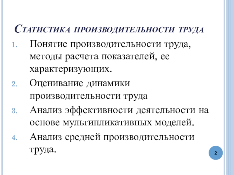 Статистика производительности трудаПонятие производительности труда, методы расчета показателей, ее характеризующих.Оценивание динамики производительности трудаАнализ эффективности деятельности на основе мультипликативных моделей.Анализ средней производительности труда.