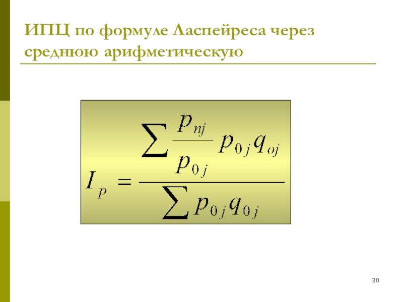 Слайд 30ИПЦ по формуле Ласпейреса через среднюю арифметическую