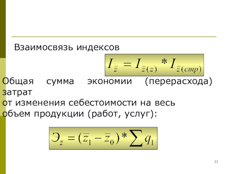 Взаимосвязь индексовОбщая сумма экономии (перерасхода) затратот изменения себестоимости на весь объем продукции (работ, услуг):