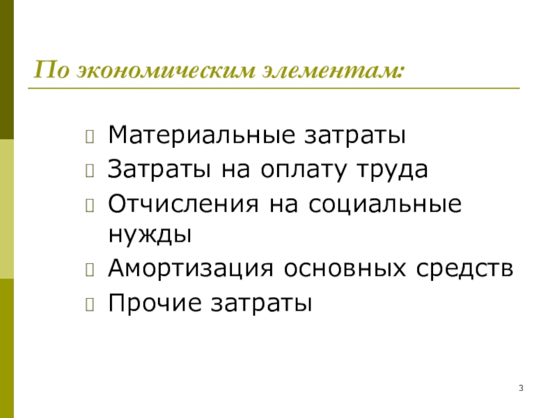 По экономическим элементам:Материальные затратыЗатраты на оплату трудаОтчисления на социальные нуждыАмортизация основных средствПрочие затраты