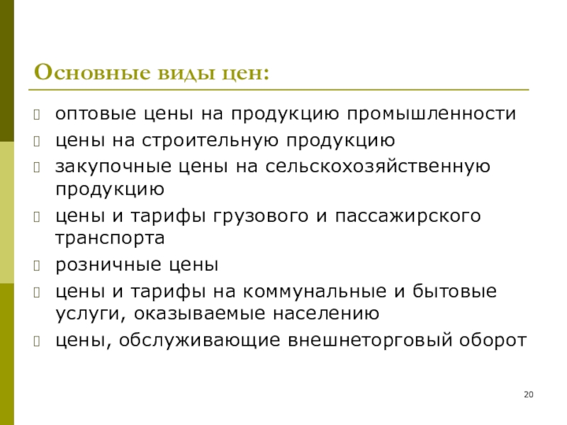 Основные виды цен:оптовые цены на продукцию промышленностицены на строительную продукциюзакупочные цены на сельскохозяйственную продукциюцены и тарифы грузового