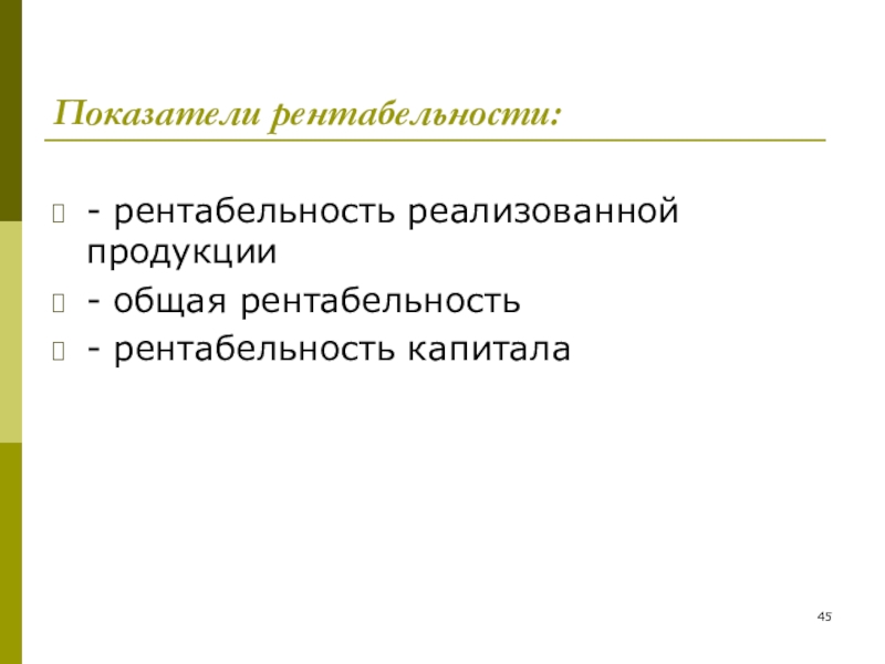 Показатели рентабельности:- рентабельность реализованной продукции- общая рентабельность- рентабельность капитала