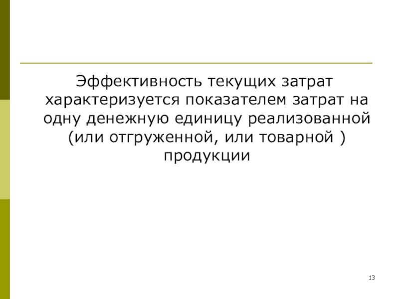 Слайд 13 Эффективность текущих затрат характеризуется показателем затрат на одну денежную