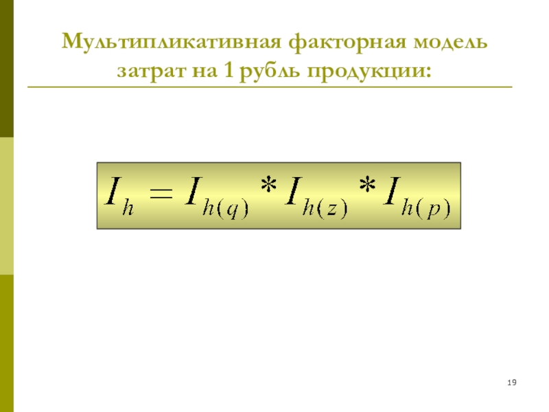 Слайд 19Мультипликативная факторная модель затрат на 1 рубль продукции: