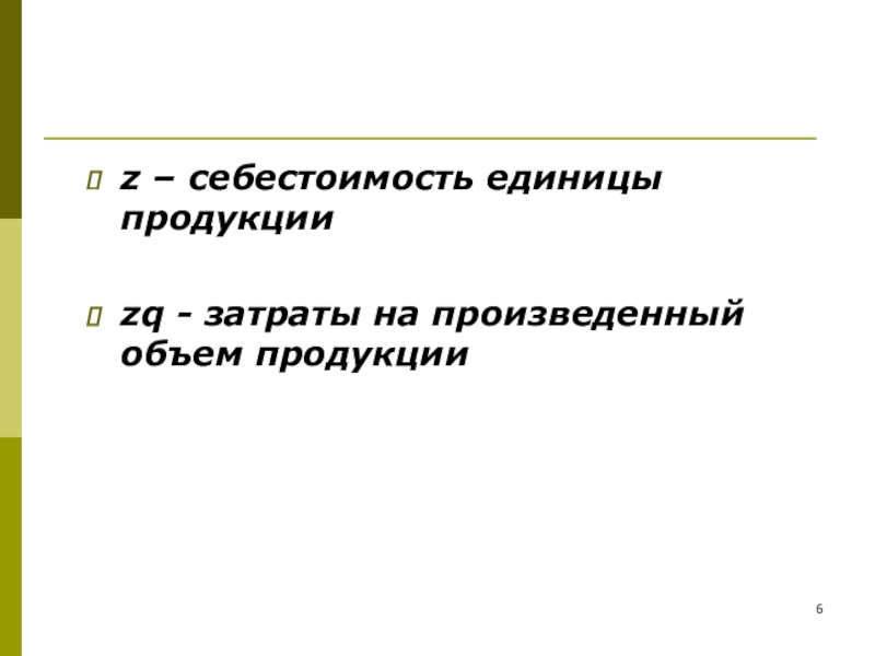 z – себестоимость единицы продукцииzq - затраты на произведенный объем продукции