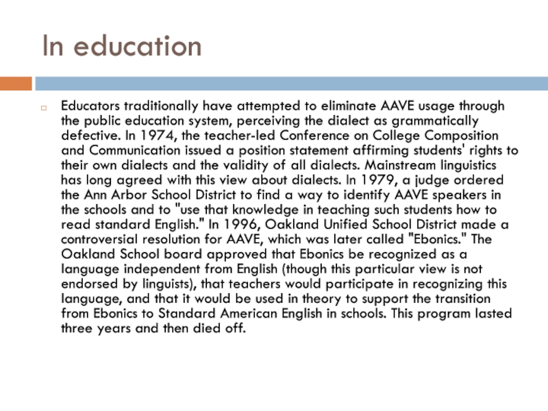 In educationEducators traditionally have attempted to eliminate AAVE usage through the public education system, perceiving the dialect
