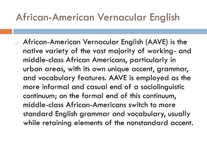 African-American Vernacular EnglishAfrican-American Vernacular English (AAVE) is the native variety of the vast majority of working- and