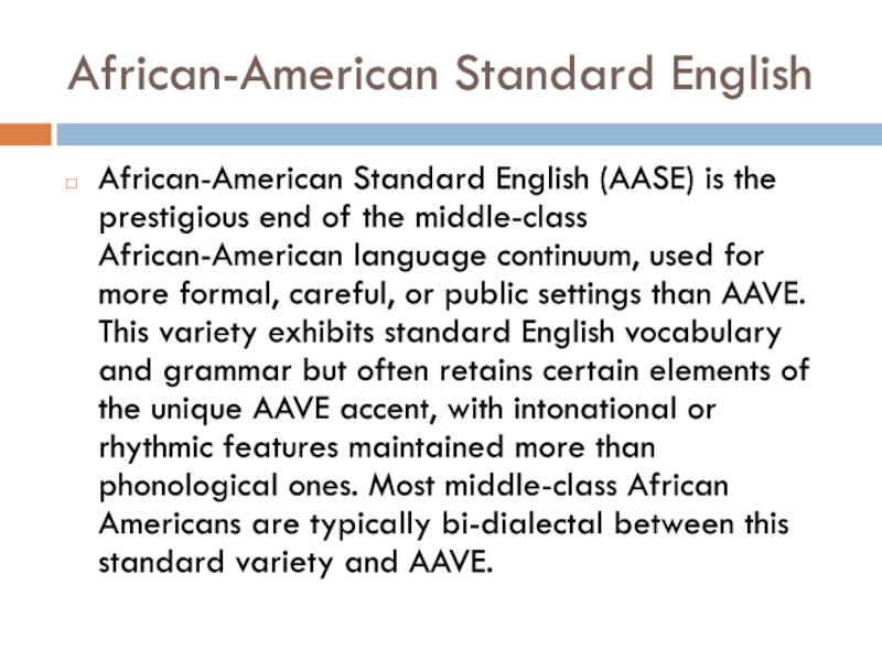 African-American Standard EnglishAfrican-American Standard English (AASE) is the prestigious end of the middle-class African-American language continuum, used