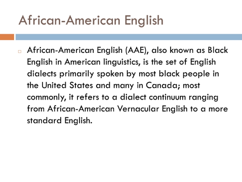 African-American EnglishAfrican-American English (AAE), also known as Black English in American linguistics, is the set of English dialects primarily spoken by most black people in the United States and many in