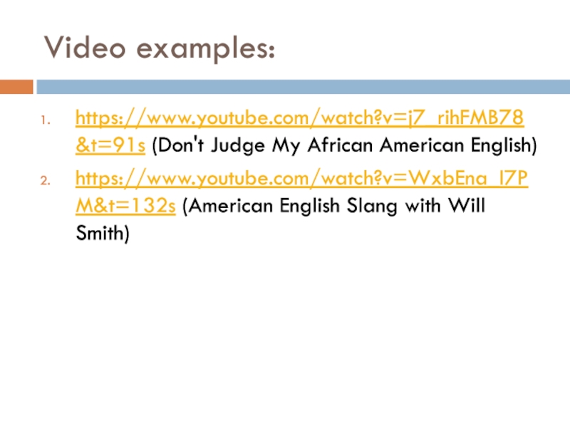 Video examples:https://www.youtube.com/watch?v=j7_rihFMB78&t=91s (Don't Judge My African American English)https://www.youtube.com/watch?v=WxbEna_I7PM&t=132s (American English Slang with Will Smith)
