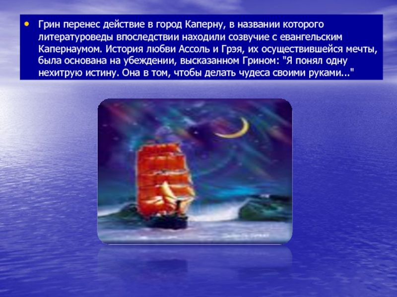 Слайд 8Грин перенес действие в город Каперну, в названии которого литературоведы