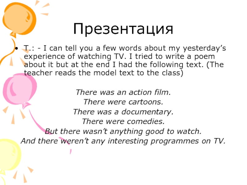 ПрезентацияT.: - I can tell you a few words about my yesterday’s experience of watching TV. I