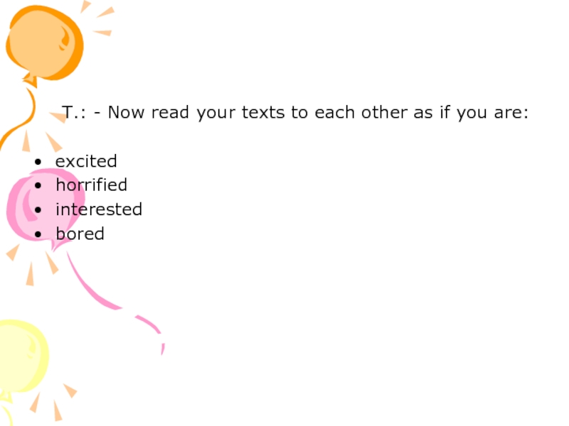 T.: - Now read your texts to each other as if you are:excitedhorrifiedinterestedbored
