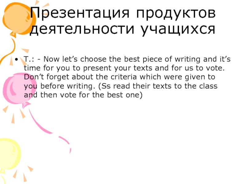 Презентация продуктов деятельности учащихсяT.: - Now let’s choose the best piece of writing and it’s time for