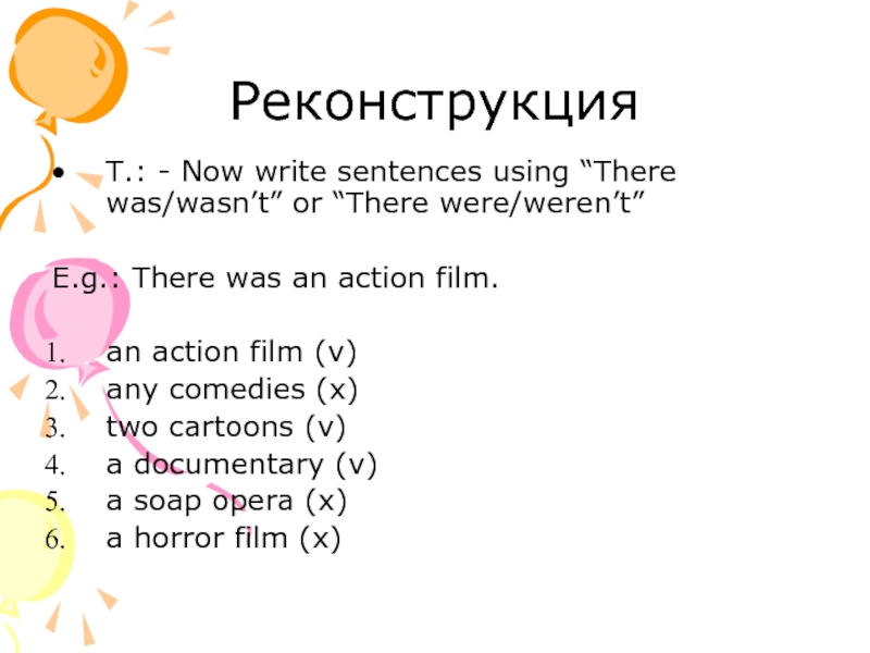 РеконструкцияT.: - Now write sentences using “There was/wasn’t” or “There were/weren’t”E.g.: There was an action film.an action