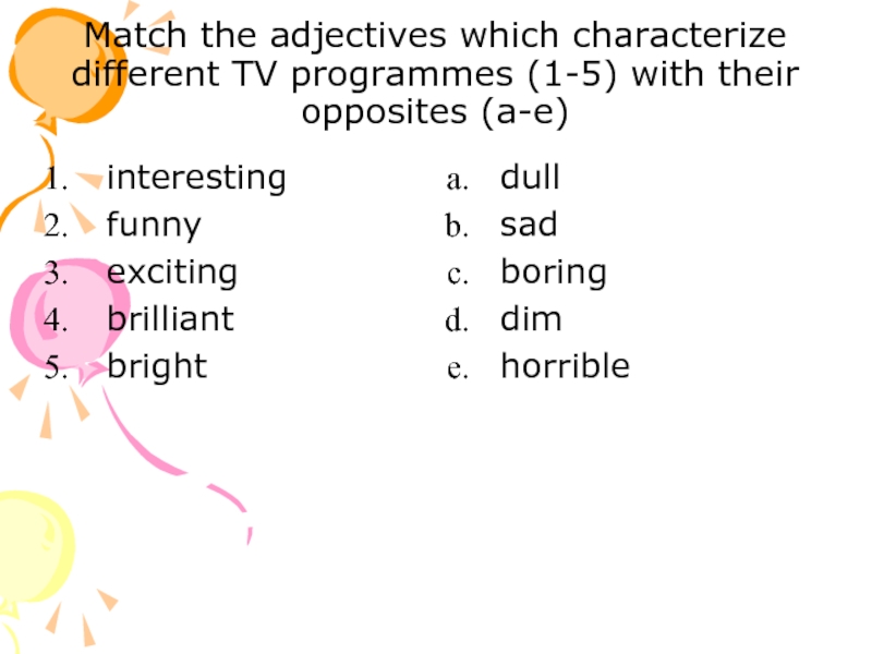 Слайд 7Match the adjectives which characterize different TV programmes (1-5) with