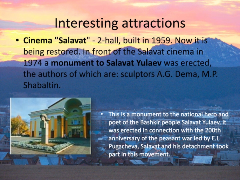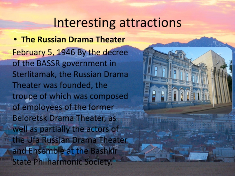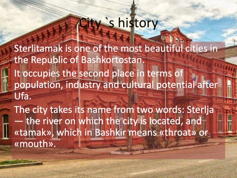 terms of population, industry and cultural potential after Ufa.The city takes its name from two words: Sterlja — the river on which the city is located, and «tamak», which in Bashkir means «throat» or «mouth».