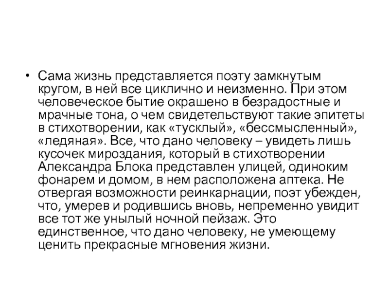 мрачные тона, о чем свидетельствуют такие эпитеты в стихотворении, как «тусклый», «бессмысленный», «ледяная». Все, что дано человеку – увидеть лишь кусочек мироздания, который в стихотворении Александра Блока представлен улицей, одиноким фонарем и домом, в нем расположена аптека. Не отвергая возможности реинкарнации, поэт убежден, что, умерев и родившись вновь, непременно увидит все тот же унылый ночной пейзаж. Это единственное, что дано человеку, не умеющему ценить прекрасные мгновения жизни.