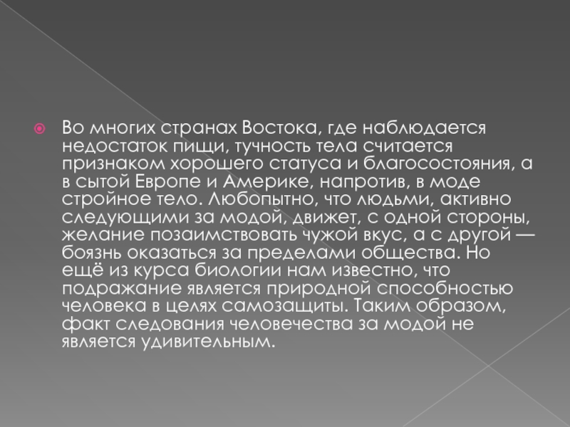 и Америке, напротив, в моде стройное тело. Любопытно, что людьми, активно следующими за модой, движет, с одной стороны, желание позаимствовать чужой вкус, а с другой — боязнь оказаться за пределами общества. Но ещё из курса биологии нам известно, что подражание является природной способностью человека в целях самозащиты. Таким образом, факт следования человечества за модой не является удивительным.