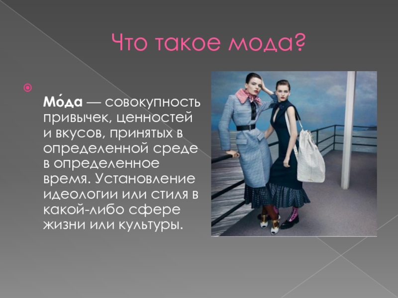 Что такое мода? Мо́да — совокупность привычек, ценностей и вкусов, принятых в определенной среде в определенное время.