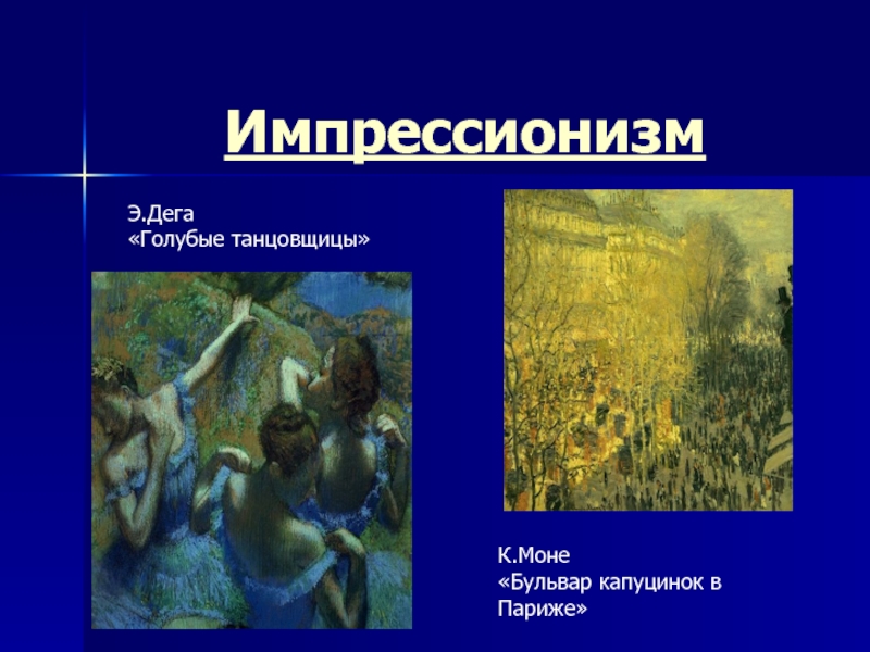 Импрессионизм (франц. impressionnisme, от impression – впечатление), направление в искусстве последней трети 19 – начала 20 вв., мастера которого, фиксируя свои мимолетные впечатления, стремились наиболее естественно и непредвзято запечатлеть реальный мир в его естественности и изменчивости.