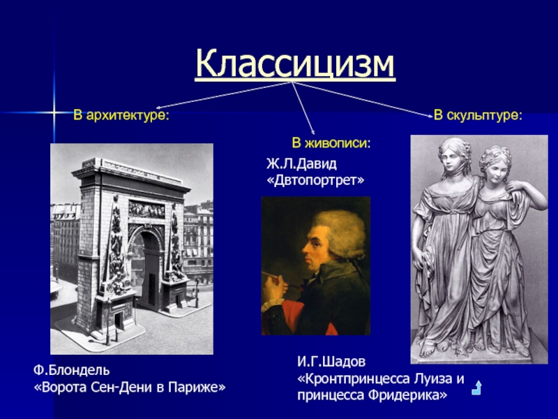 Классицизм- художественный стиль в европейском искусстве 11–начала 19 вв., одной из важнейших черт которого было обращение к формам античного искусства, как к идеальному эстетическому и этическому эталону.
