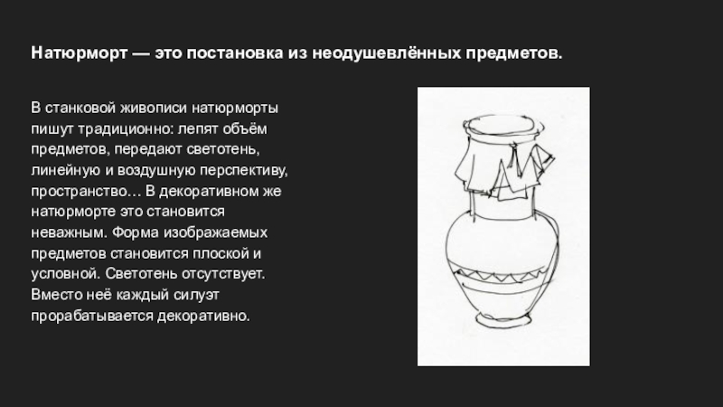 воздушную перспективу, пространство… В декоративном же натюрморте это становится неважным. Форма изображаемых предметов становится плоской и условной. Светотень отсутствует. Вместо неё каждый силуэт прорабатывается декоративно.