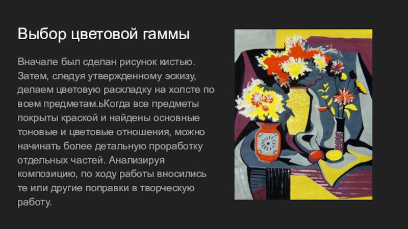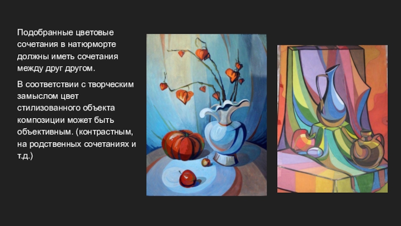 Слайд 13Подобранные цветовые сочетания в натюрморте должны иметь сочетания между друг