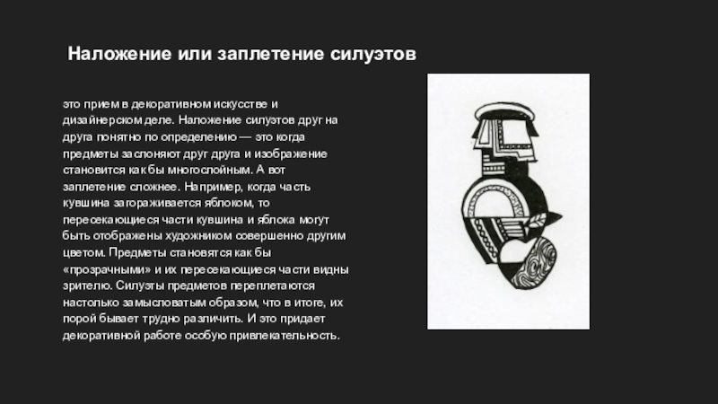это когда предметы заслоняют друг друга и изображение становится как бы многослойным. А вот заплетение сложнее. Например, когда часть кувшина загораживается яблоком, то пересекающиеся части кувшина и яблока могут быть отображены художником совершенно другим цветом. Предметы становятся как бы «прозрачными» и их пересекающиеся части видны зрителю. Силуэты предметов переплетаются настолько замысловатым образом, что в итоге, их порой бывает трудно различить. И это придает декоративной работе особую привлекательность.