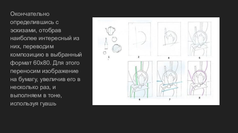 Слайд 8Окончательно определившись с эскизами, отобрав наиболее интересный из них, переводим