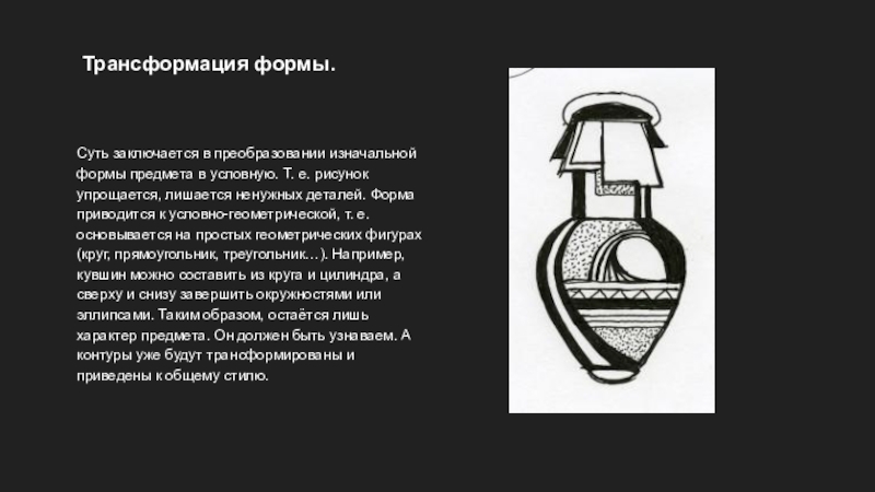 Суть заключается в преобразовании изначальной формы предмета в условную.