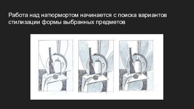 Слайд 7Работа над натюрмортом начинается с поиска вариантов стилизации формы выбранных