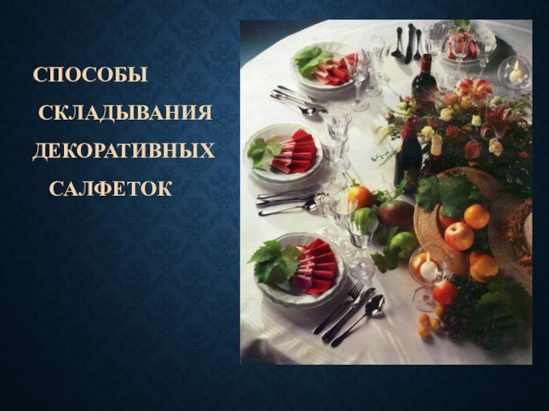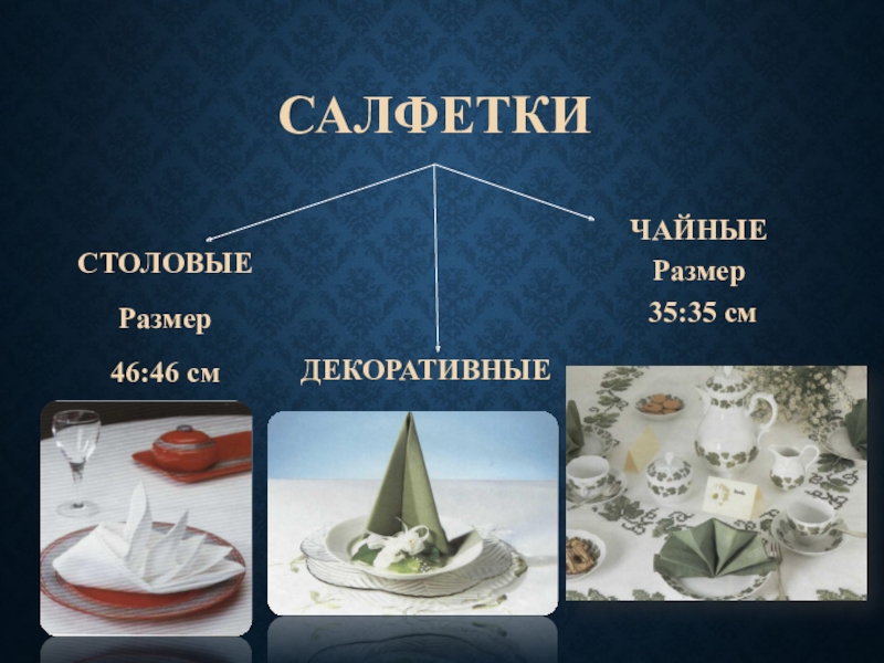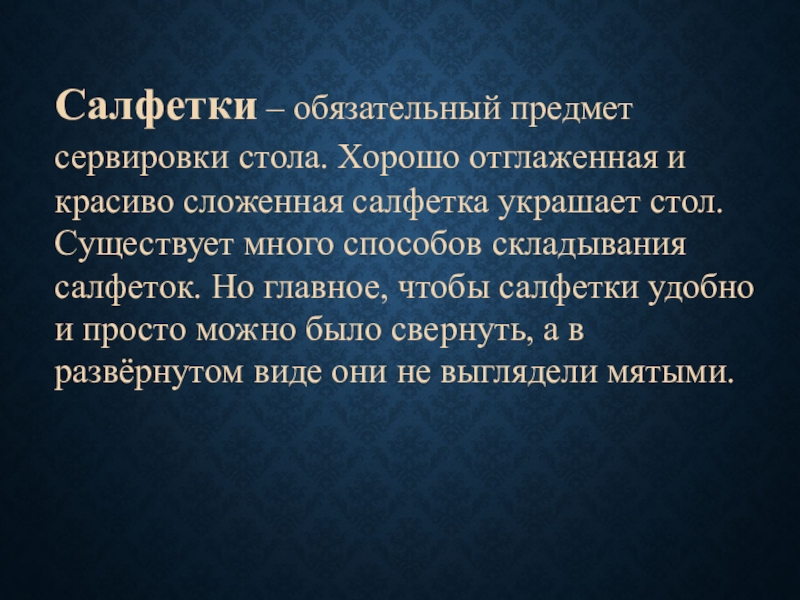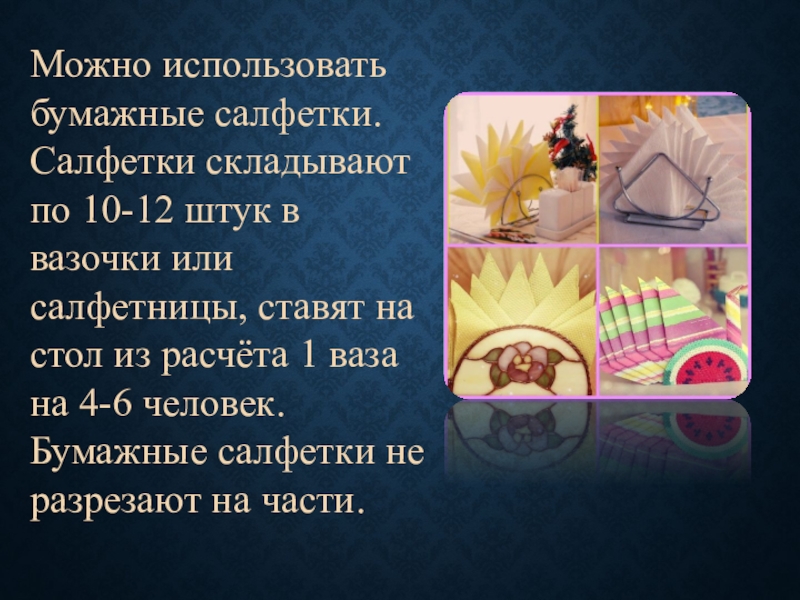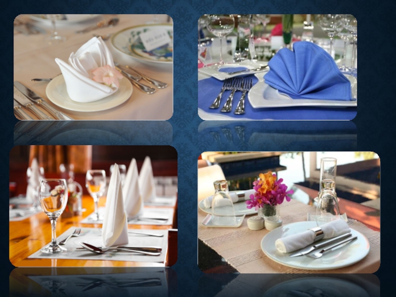 Слайд 11Салфетки – обязательный предмет сервировки стола. Хорошо отглаженная и красиво