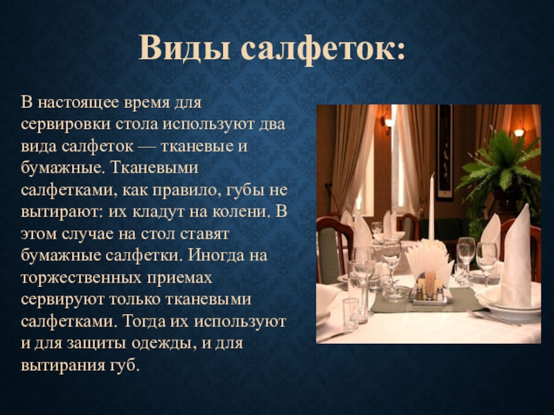 салфеток — тканевые и бумажные. Тканевыми салфетками, как правило, губы