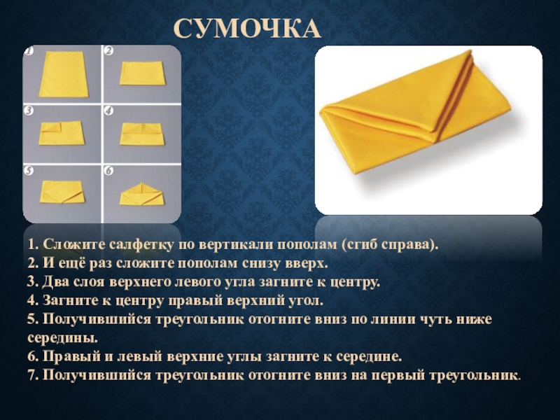 Сложите салфетку по вертикали пополам (сгиб справа).